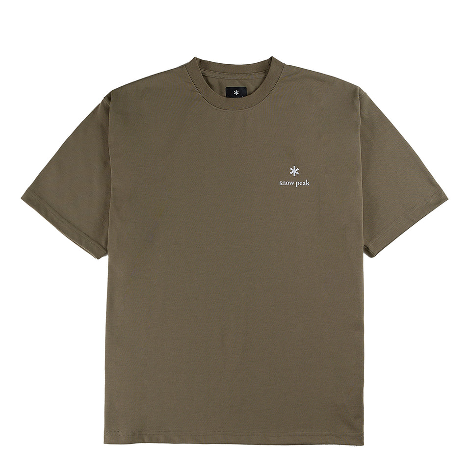 The Snow Peak Logo T-Shirt in Khaki is a relaxed-fit tee designed for everyday wear. Crafted from a soft polyester-cotton blend with added stretch in the ribbed neckline, it balances comfort and durability. Featuring a chest logo and a subtle print at the back of the neck, this versatile piece is an effortless wardrobe staple.