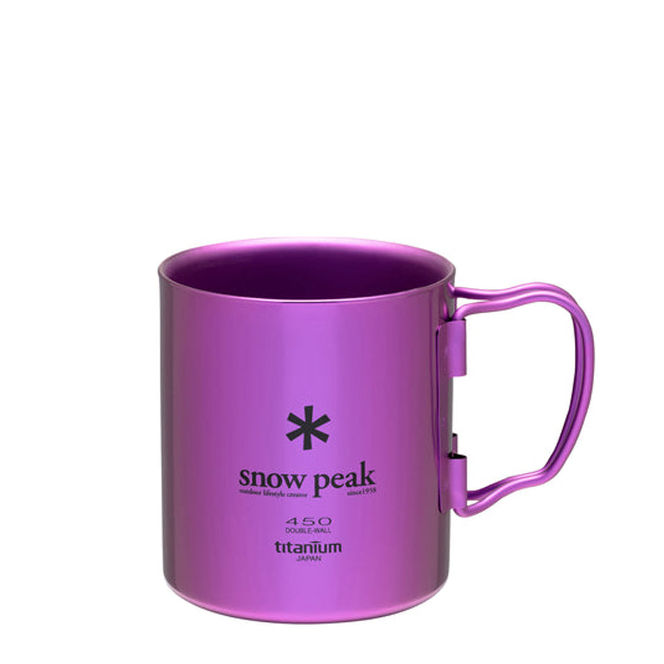 This Snow Peak Titanium Double Wall Cup 450 in Purple is perfect for the outdoors and will keep your drink hot. With a coloUrful anodised finish, it's lightweight and compact, making it a must-have for any adventure. The handles are foldable, saving space in your pack.