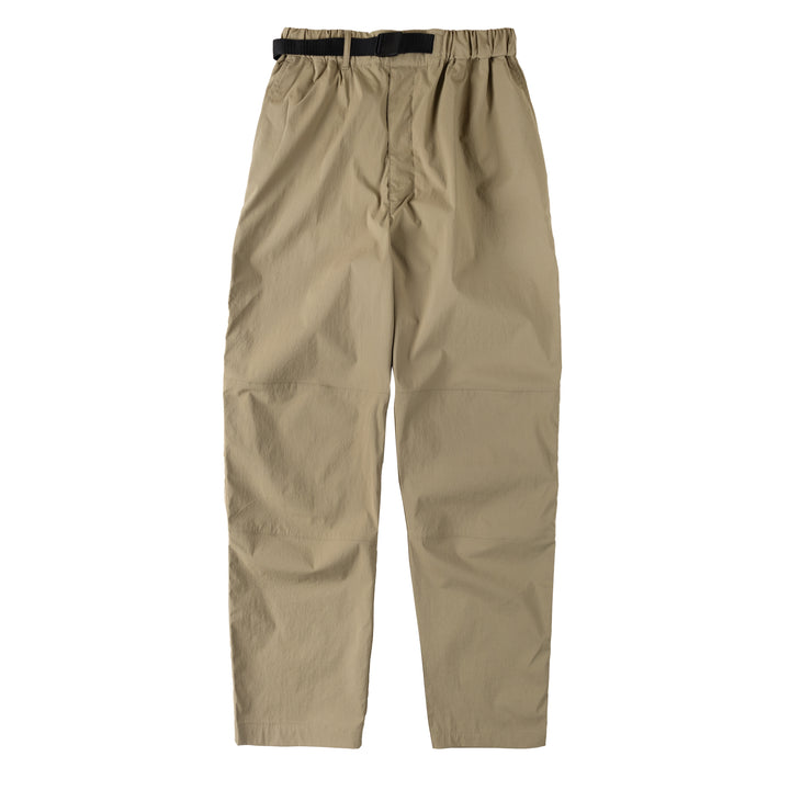 The Snow Peak Utility Pants in Greige are unisex trousers designed for both urban and outdoor use. Made from a stretchy nylon-polyurethane blend with a durable water-repellent finish, they feature an elasticated waistband with an integrated belt, zipped side pockets, and a natural crumpled look for effortless style and comfort.