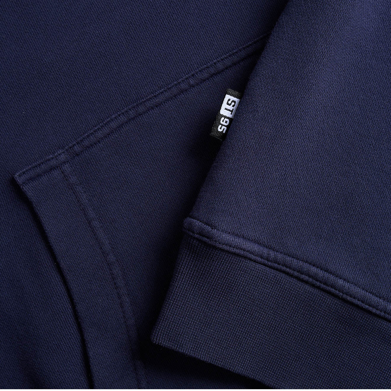 The ST95 Alcantara Patch Back Hoodie in Navy is a relaxed-fit sweatshirt crafted from 100% OCS-certified organic cotton. This product in this colour features garment-dyed 450GSM fabric and this product in this colour includes a lined hood, ribbed-edge kangaroo pocket, ribbed collar and cuffs, and distinctive appliquéd patch logos on the left shoulder and centre back.