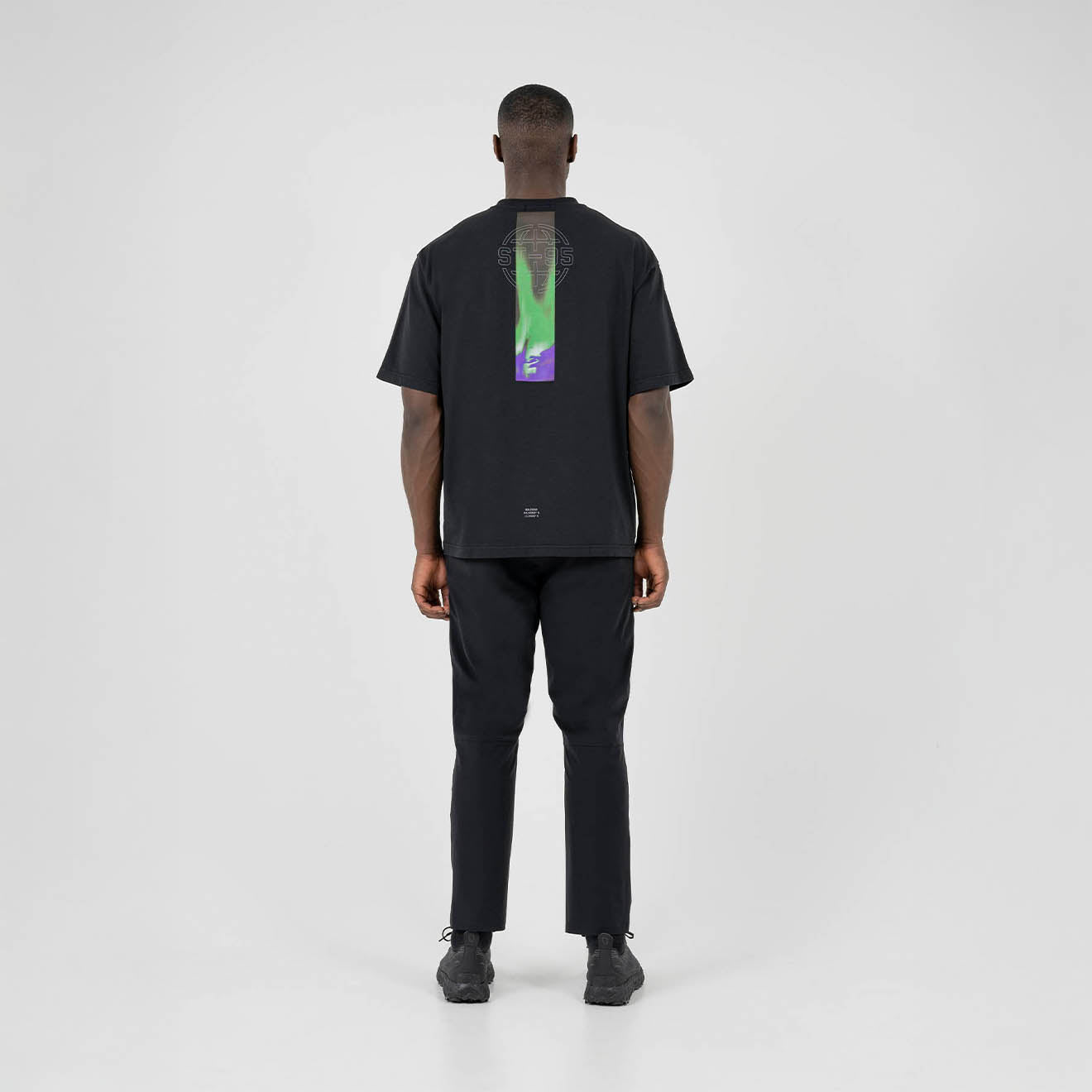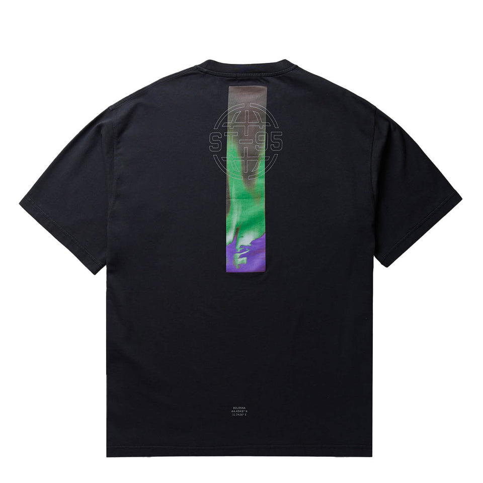 The ST95 Aurora SS T-Shirt in Black is a relaxed-fit short sleeve tee made from 100% organic cotton jersey. This product in this colour features a garment-dyed 200GSM fabric and this product in this colour includes a globe print on the left chest, a bold Northern Lights graphic across the back, a ribbed collar, coverstitched seams, and a branded ST95 tab at the side seam.