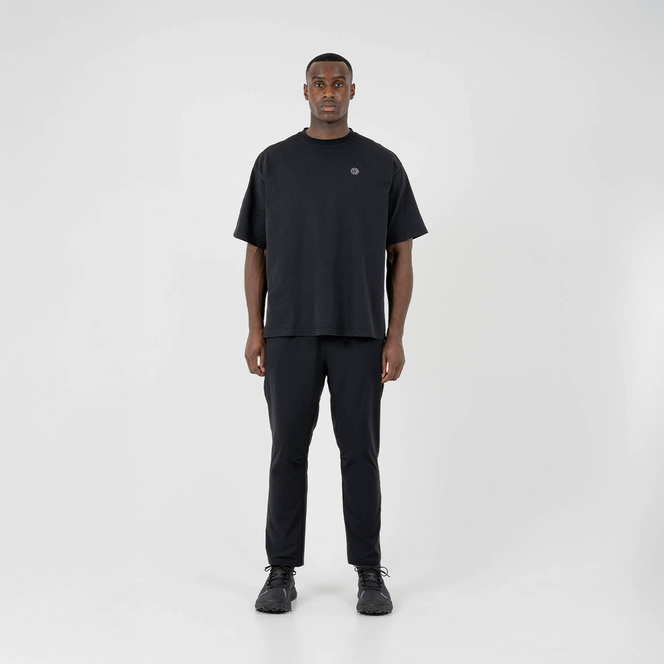 - Globe print on left chest
