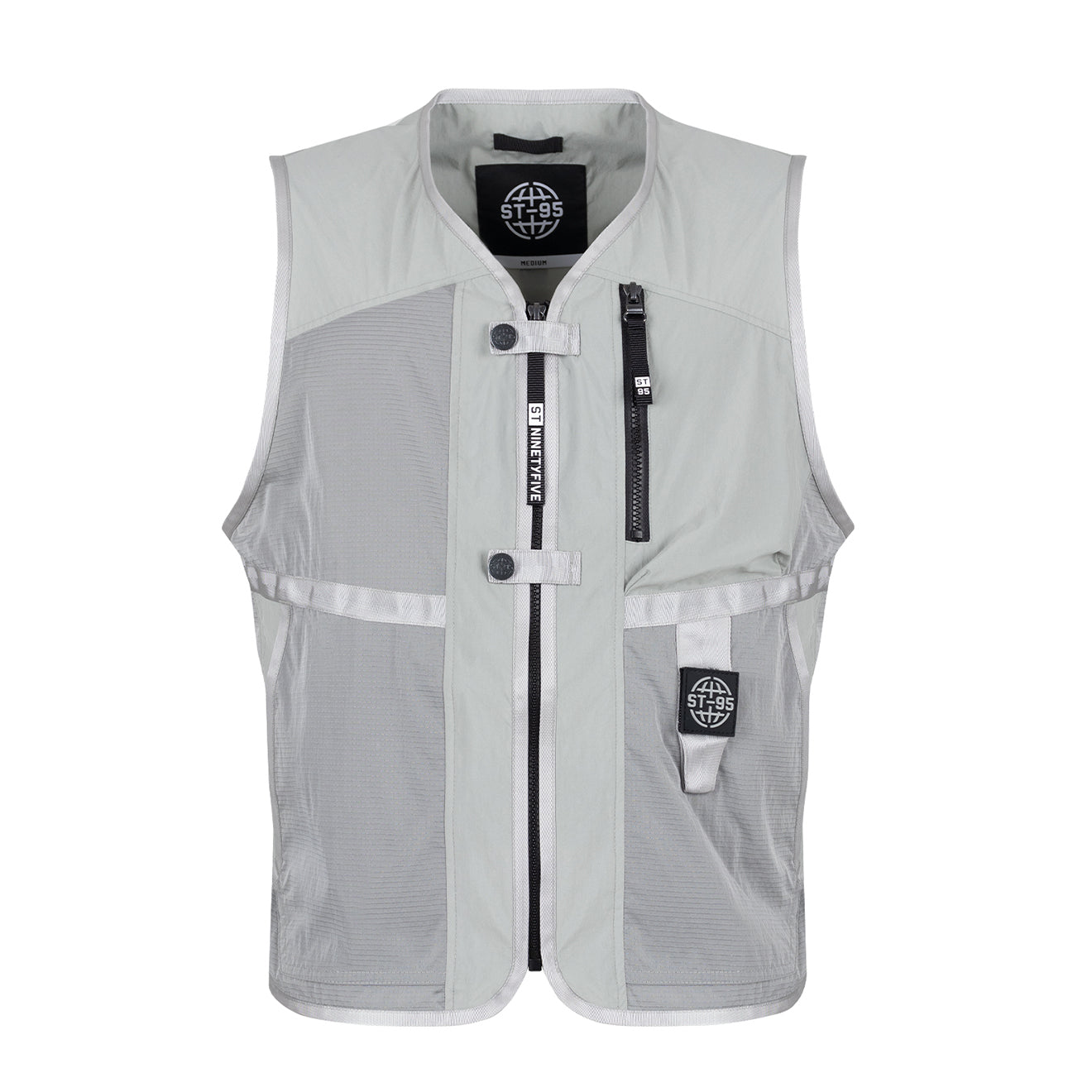 The Delta Vest is a military inspired statement piece, made from 100% recycled nylon and featuring contrast peach and metallic fabrics throughout. Details include a zipped pocket to the left chest, 2 hand pockets, and recycled webbing detail. Signed off with the ST95 silicone detachable badge to the front.