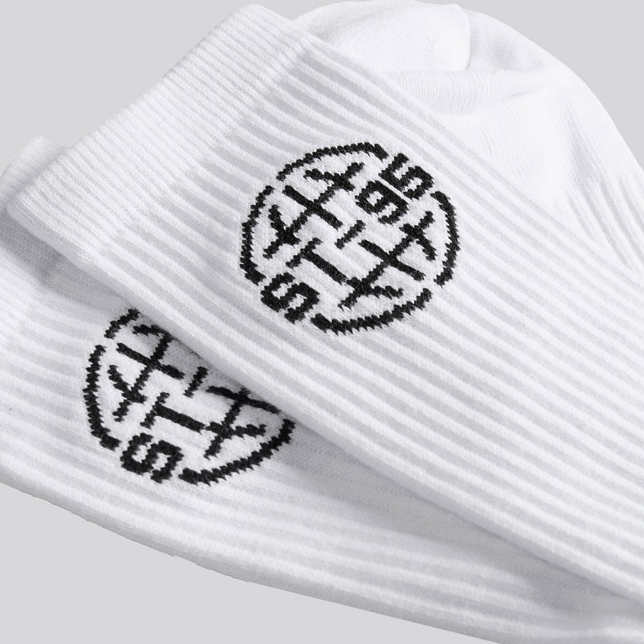 The ST95 Globe Socks in White are designed for everyday comfort with a nod to classic sportswear. This product in this colour features a ribbed knit construction and this product in this colour includes cushioning underfoot and a secure stretch cuff, finished with the ST95 Globe jacquard logo.