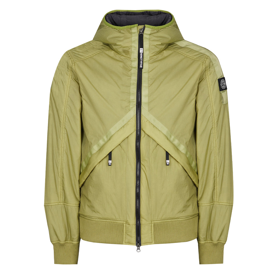 THE HELIO HOODED BLOUSON IS A SHORT ULTRA-LIGHTWEIGHT AND TRANSLUCENT HOODED JACKET, SHOWING THE LAYERS WITHIN THE GARMENT’S CONSTRUCTION, INCLUDING THE LIGHTWEIGHT RECYCLED POLYESTER WADDING. DETAILING IS INSPIRED BY A VERY RARE RAF ISSUE LIFE PRESERVER WAISTCOAT. (MODEL AIRCREW MK27 S)