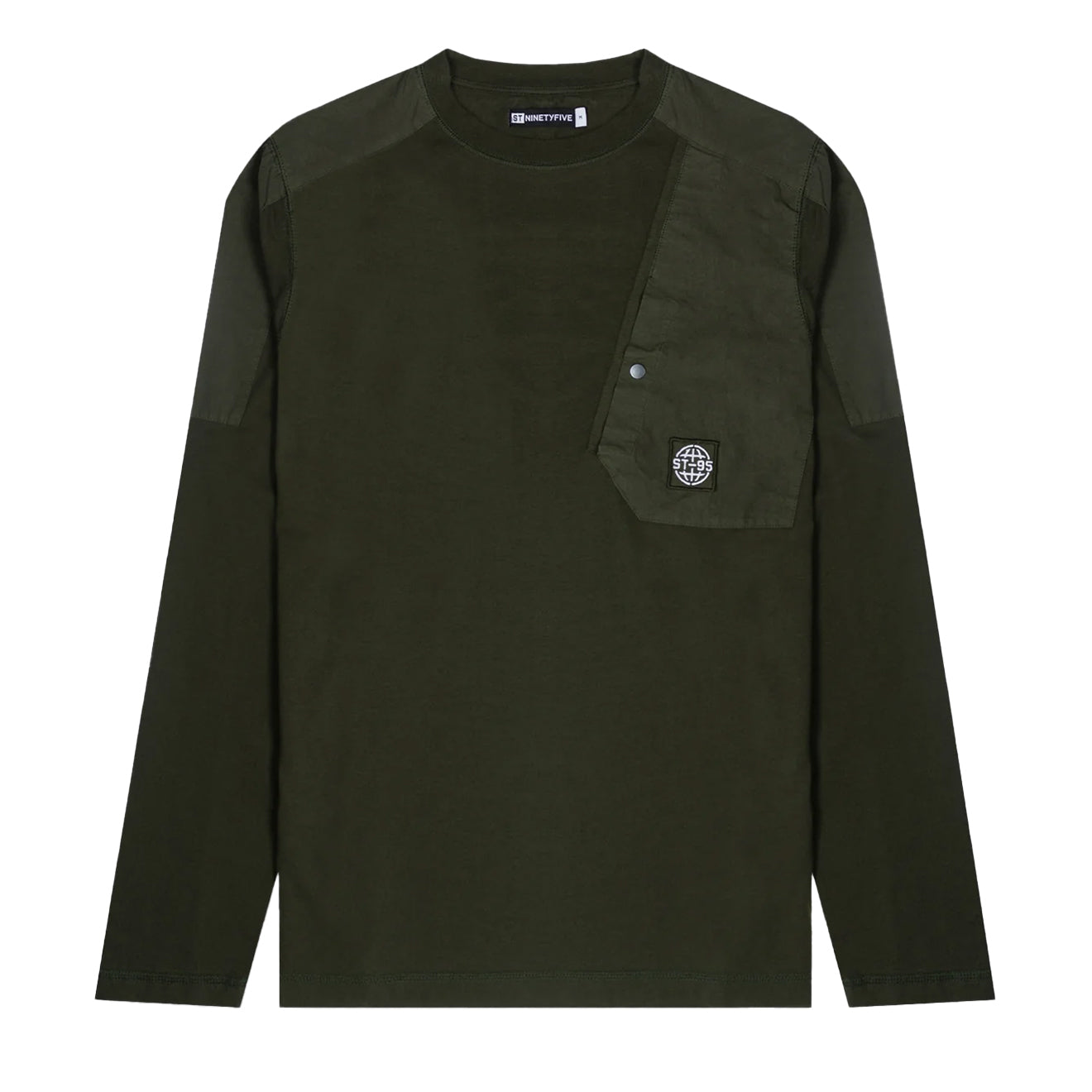 ST95 continues to investigate technical sportwear and distinctive functional pieces. The Long Sleeve ST95 Seasonal Tee is garment dyed in GOTS certified dye house. Featuring a woven fabric overlay on back yoke and upper sleeve, a woven fabric chest pocket with a snap fastening and a classic overdyed globe badge on the chest pocket. This piece is crafted from 100% organic cotton jersey with a carbon brushed finishing with a weight of 180gsm. This piece is an excellent example of how ST95 continues to reinvent classic staples with unique design touches.
