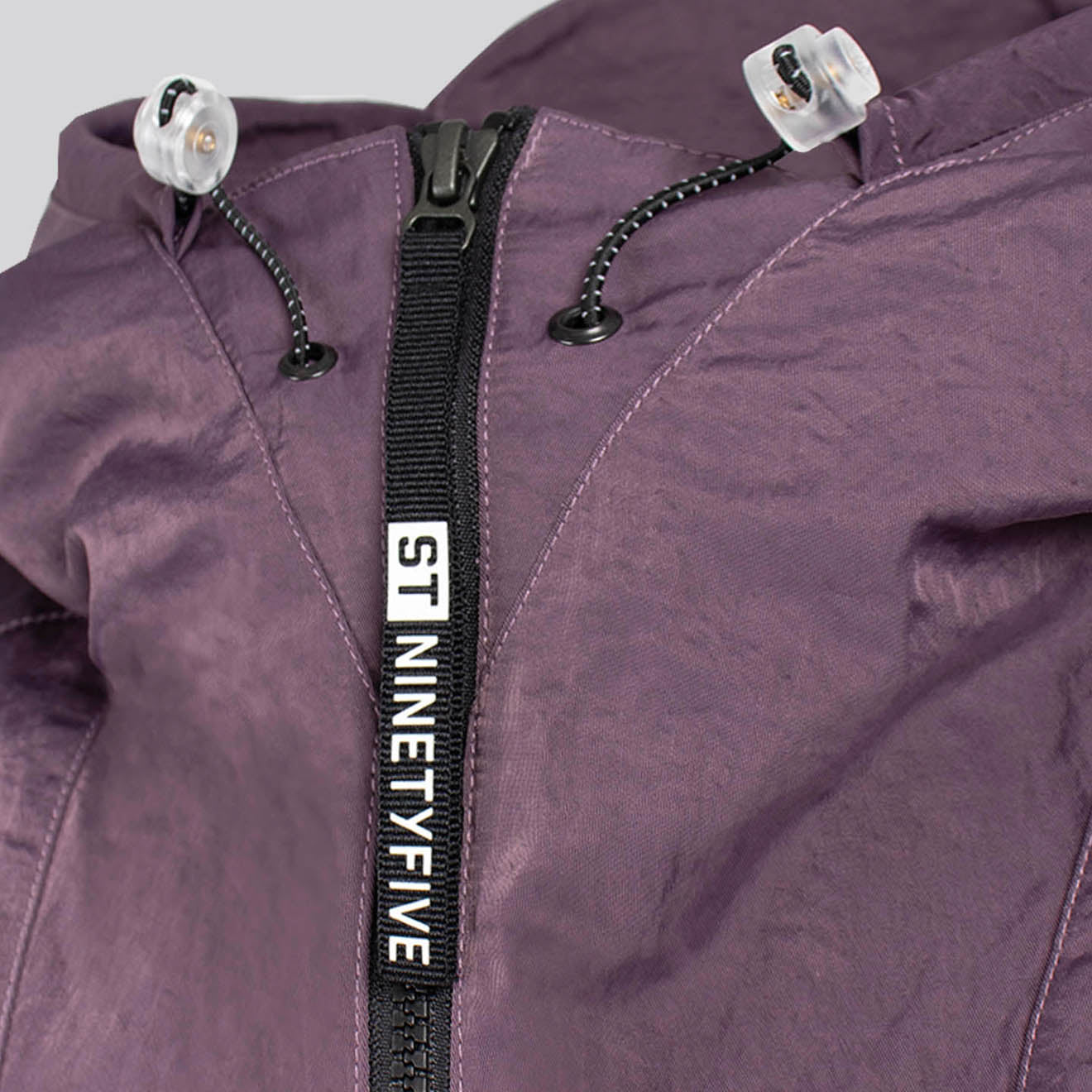 The ST95 Nera Jacket in Plum is a midweight, water-resistant jacket made from 100% nylon. This product in this colour features a subtle metallic sheen and this product in this colour has a relaxed fit with central front panel pockets, a YKK double zipper, adjustable hood and cuffs, and the signature ST95 globe patch on the left shoulder.