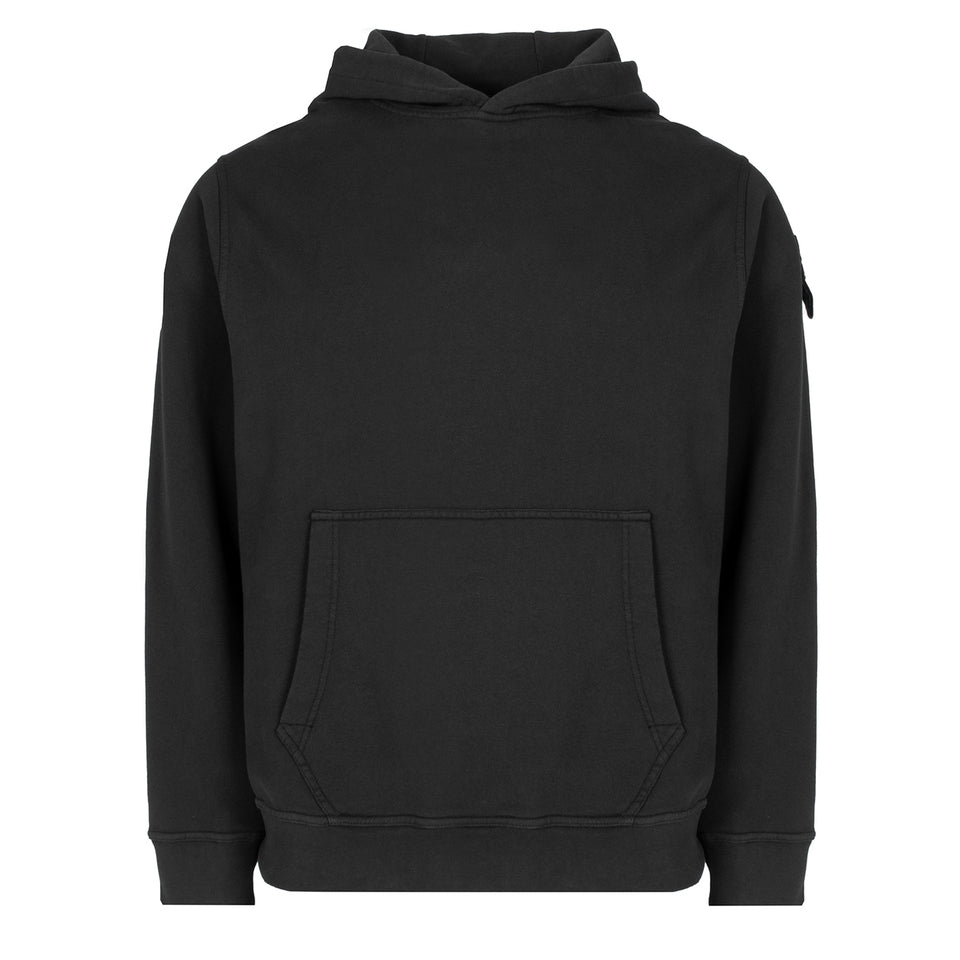 The ST95 Nucleo Uno Hooded Sweat in Black features a 3-piece hood design and a relaxed, slightly oversized fit for a dropped shoulder look that drapes comfortably. Made from 400GSM OCS-certified organic cotton, it's sustainably garment dyed. The hoodie includes an ST95 appliqué badge on the left sleeve with recycled tape detail, pull cords for the hood, and side tab branding.