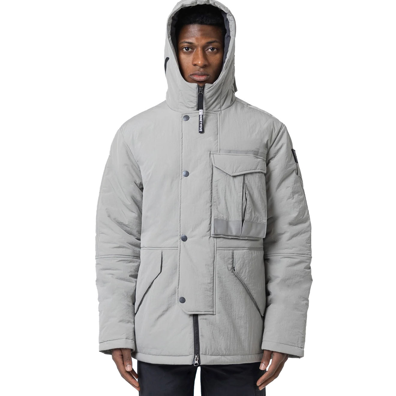 The ST95 Proximity Parka in Light Grey is a hooded, mid-length jacket inspired by proximity suits used in firefighting. Constructed from lightweight recycled nylon and insulated with recycled padding, this parka combines superior performance with sustainable design. Engineered with technical features for optimal protection and comfort, the Proximity Parka is perfect for both challenging conditions and everyday wear, offering a modern aesthetic without compromising on durability.