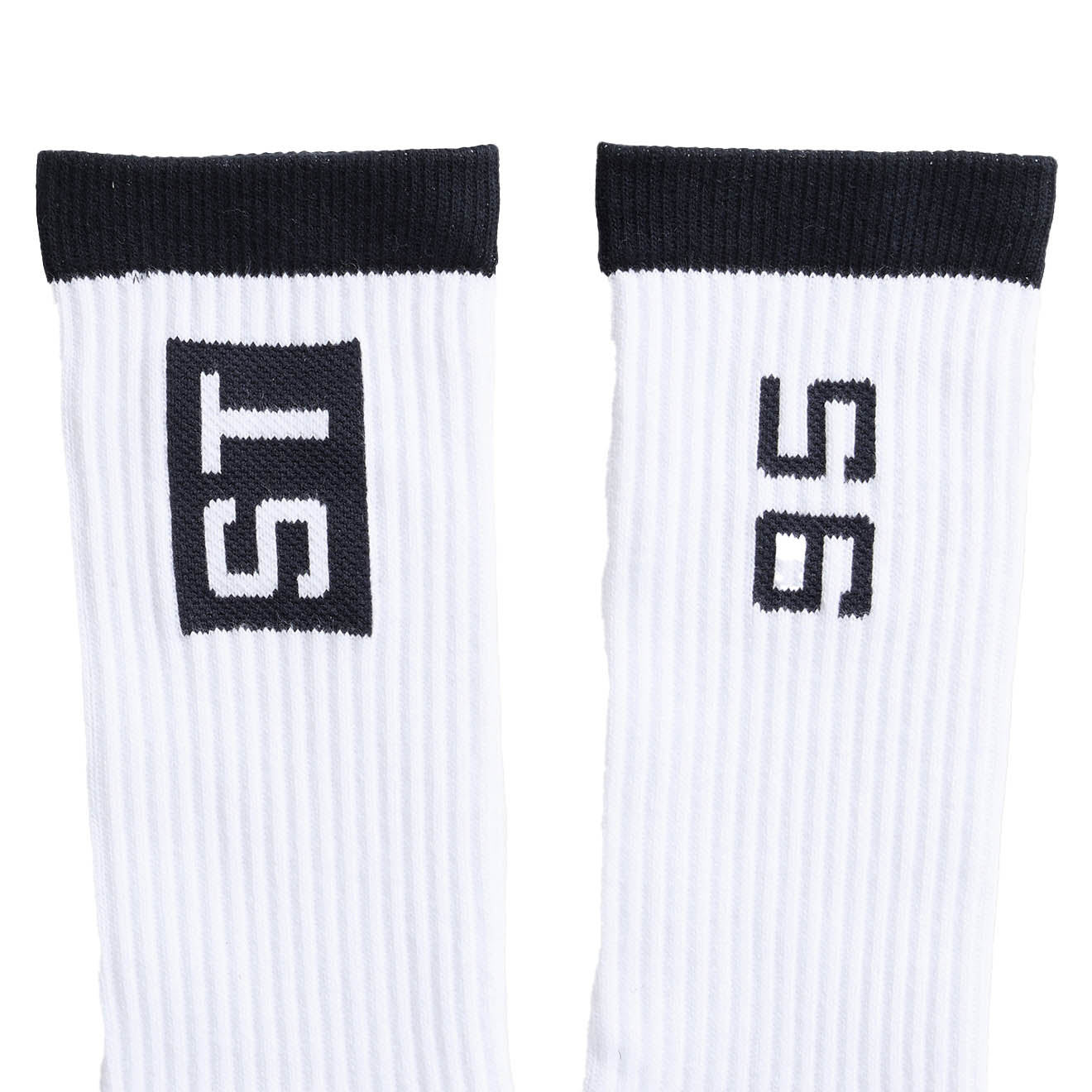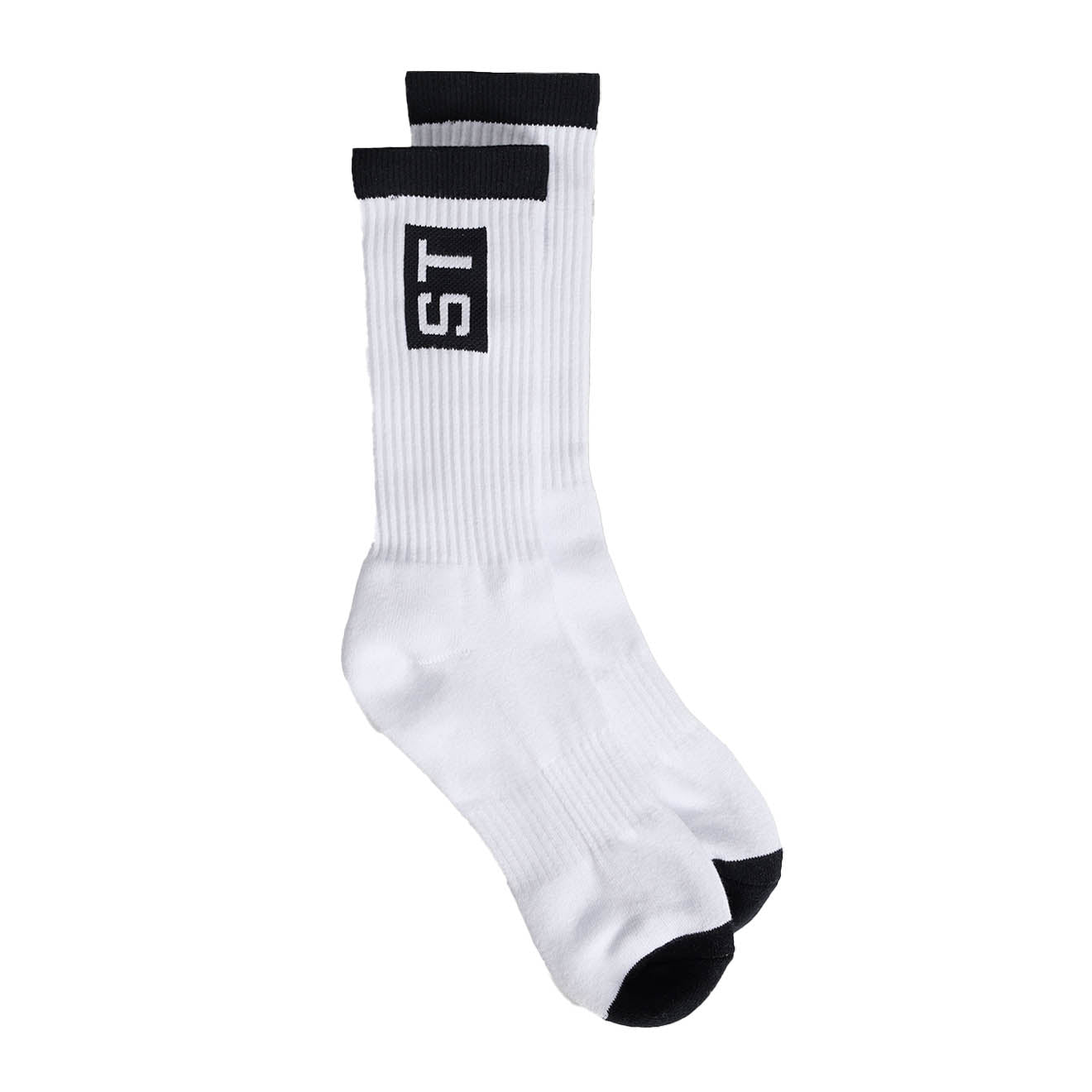 The ST95 ST Socks in White are designed for everyday comfort with a classic athletic look. This product in this colour features a ribbed knit construction and this product in this colour includes cushioning through the sole, a stretch cuff for a secure fit, and the signature ST95 jacquard branding.