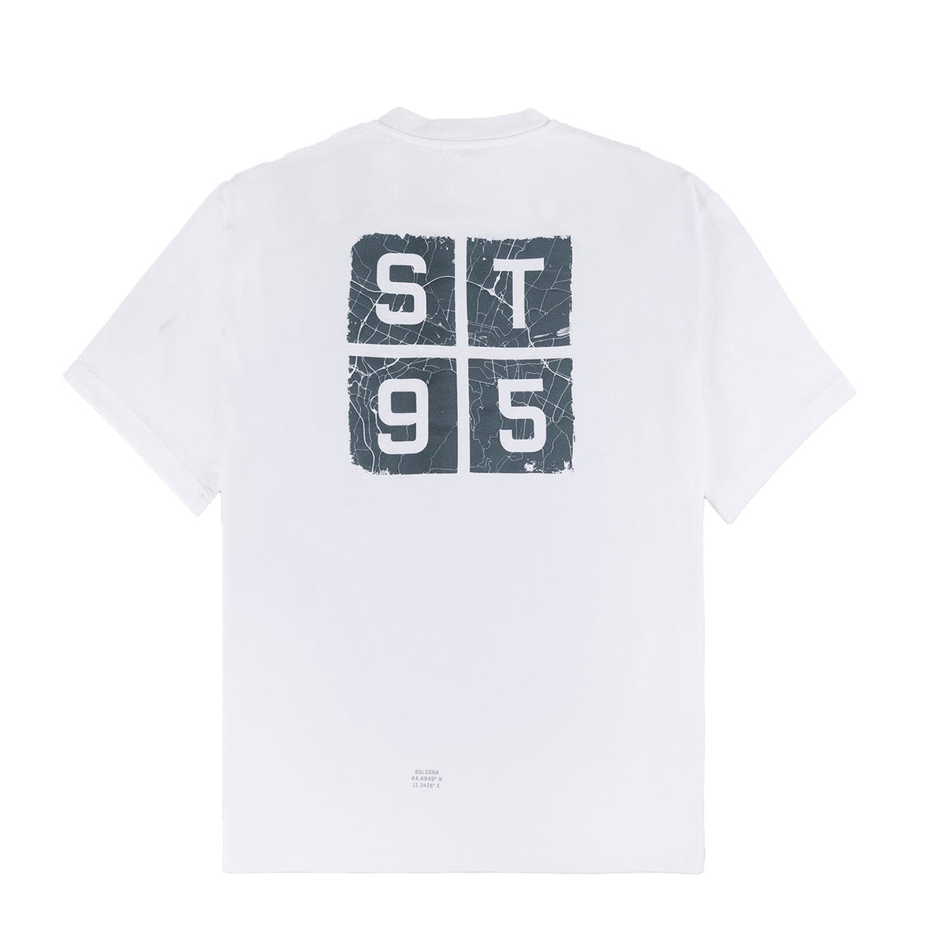 The Varese Tee is crafted from 200GSM 100% organic cotton jersey and finished in a clean white base. Paying homage to the birthplace of ST95, the tee features a subtle globe logo print on the left chest and a bold back graphic incorporating Bologna’s map within the iconic ST95 branding. Designed with a relaxed fit, it merges cultural heritage with contemporary streetwear sensibility.