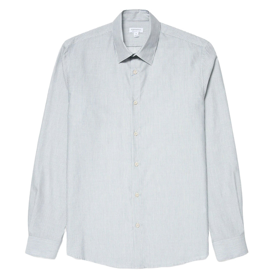 This Sunspel Cotton Cashmere Shirt Light Blue and white is crafted from an Italian fabric which combines the finest cotton with luxuriously smooth cashmere. This shirt has an exceptionally lightweight, soft feel. This shirt has a regular fit and a timeless, elegant finish.