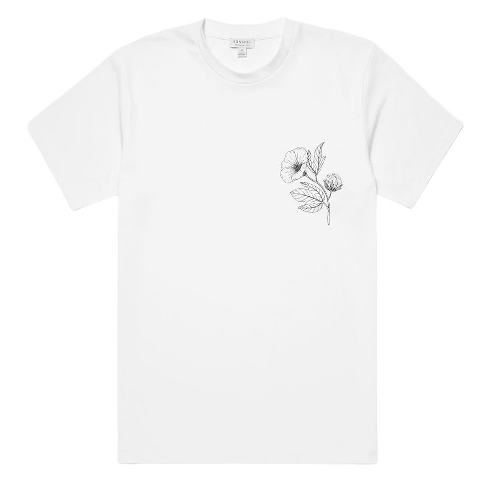 Sunspel Flower Print T-Shirt in White. Sunspel's Riviera T-shirt, featuring a flower screen print by British botanical artist Katie Scott. Tailored for a sleek, slim fit from the finest extra-long staple Supima cotton.