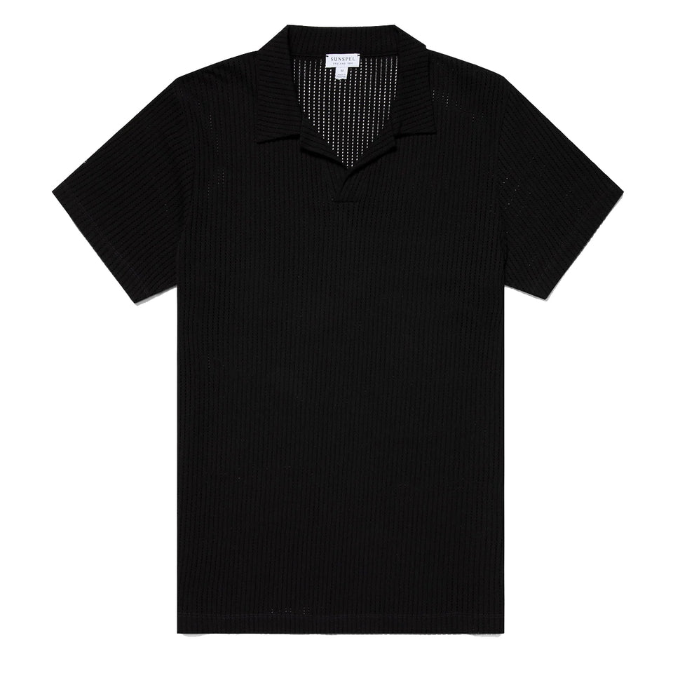 Sunspel Linear Mesh Polo Shirt in Black. A classic open collar polo in a luxurious linear cotton mesh. The fabric is a replica of a swatch in Sunspel's archive which was originally developed in the 1950s and is now made with the finest, extra-long staple Supima cotton. Soft and comfortable, it has an easy, relaxed fit making it a perfect high summer piece.