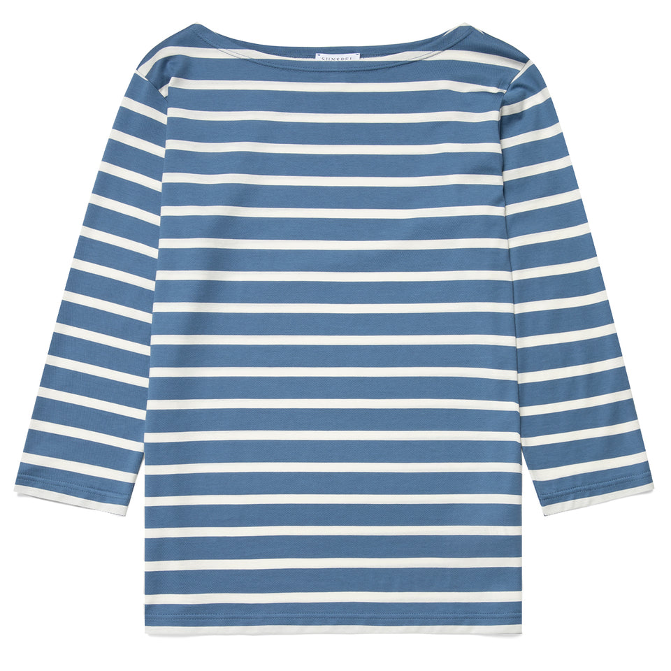 Sunspel Womens 3/4 Sleeve Boat Neck T-Shirt Bluestone / Ecru Breton Stripe