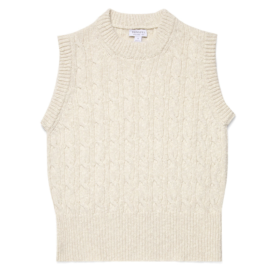 Expertly knitted in Scotland using luxurious lambswool from Todd and Duncan, one of Britain's oldest spinners, this cable-stitch sweater offers a beautifully rich texture. The yarn’s natural slub and subtle two-color twist enhance its depth, while the neat, cropped design creates an elegant balance of proportions. A perfect layering piece, it pairs effortlessly with an oversized poplin shirt and wide-leg trousers.