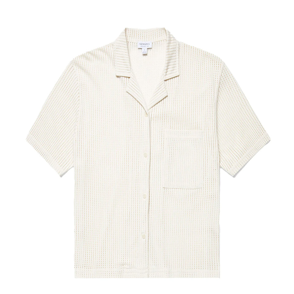 The is Sunspel Womens Lace Mesh Shirt in Ecru is crafted from the softest Californian Supima cotton in an easy textured mesh inspired by our Nottingham heritage in lace making. Slightly cropped with a boxy cut and camp collar neck, it is a perfect, cool high summer piece.