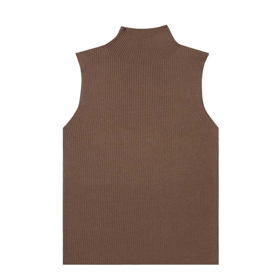 The Sunspel Womens Mulberry Silk Rib Vest Jumper in Dark Sand is crafted from a pure Italian-spun mulberry silk ribbed knit, this sleeveless vest jumper has a lean body fit and is beautifully smooth against the skin. With a grown-on mock neck and clean edges, it is perfect for day-to-evening wear. Pair with a wide-leg pleated trouser.