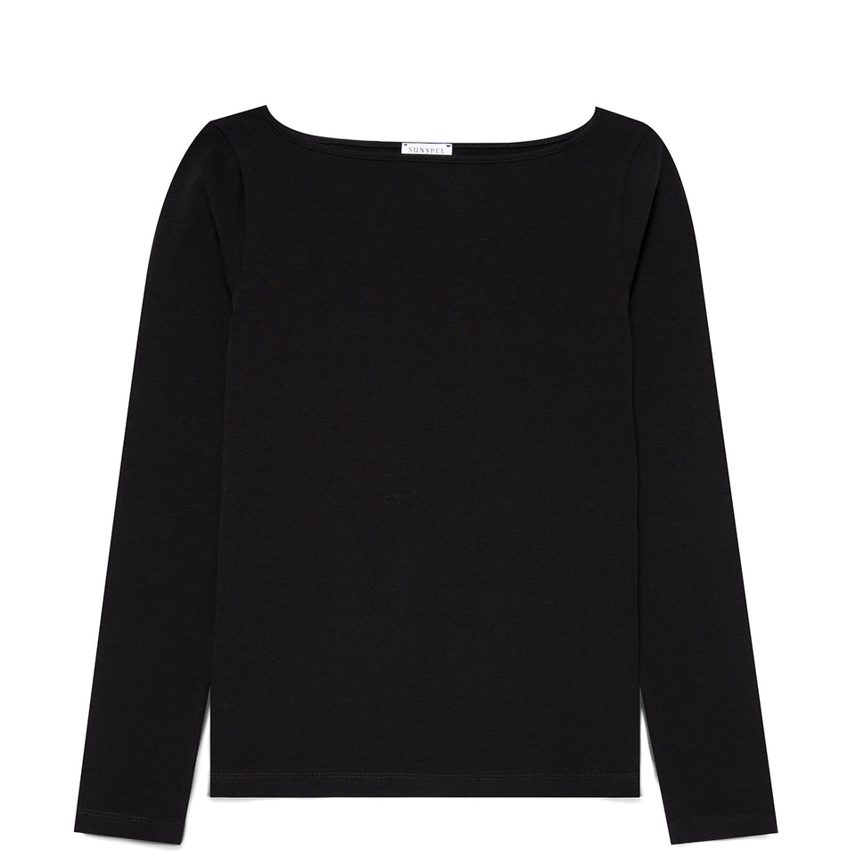 The Sunspel Womens Slash Neck L/S Top in Black is made from super-soft stretch cotton jersey for exceptional comfort. Featuring a slim fit and elegant slash neckline, it offers a refined, flattering silhouette.