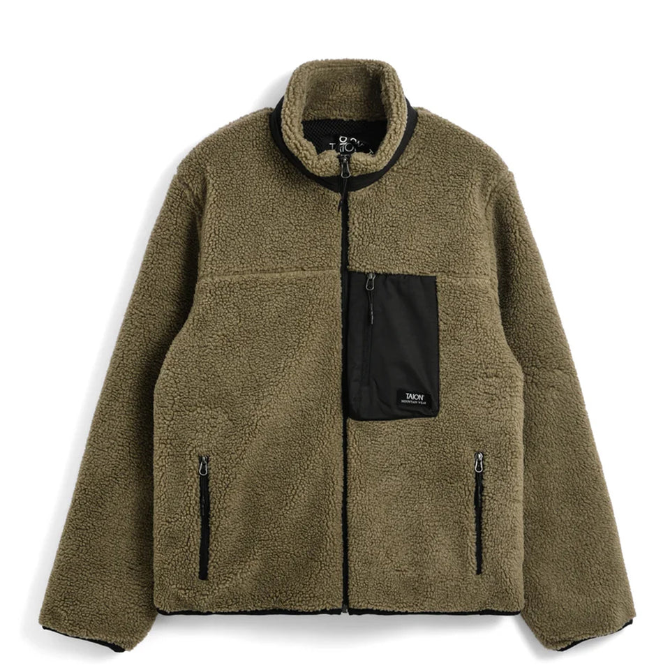The Taion Mountain W-Zip Boa Hi Neck Jacket in dark beige and black combines plush boa fleece with a protective high-neck design for reliable warmth. Its easy front zip and lower slit allow better movement, while the mesh lining and multiple zipped pockets ensure comfort and practicality whether worn alone or layered.