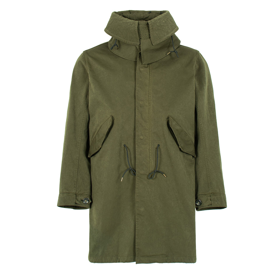 Ten C Hooded Parka Jacket in Green. Combining innovative Italian craftsmanship with unique Japanese fabrics, the Parka is constructed with 12oz OJJ (Original Japanese Jersey) fabric. Inspired by fishtail coats first used by the United States Army during the Korean War, the jacket features a removable hood with a built-in wire allowing it to be shaped to the wearer's preference.