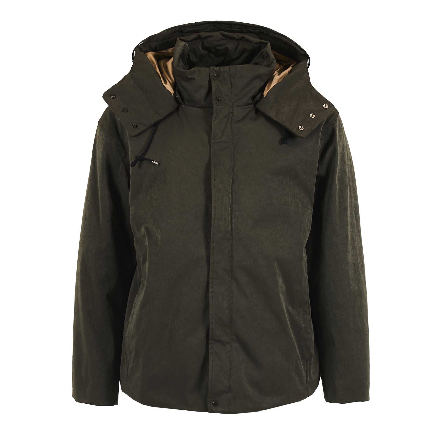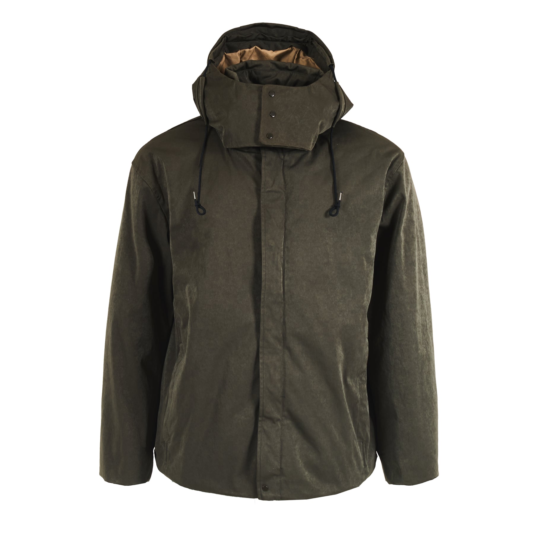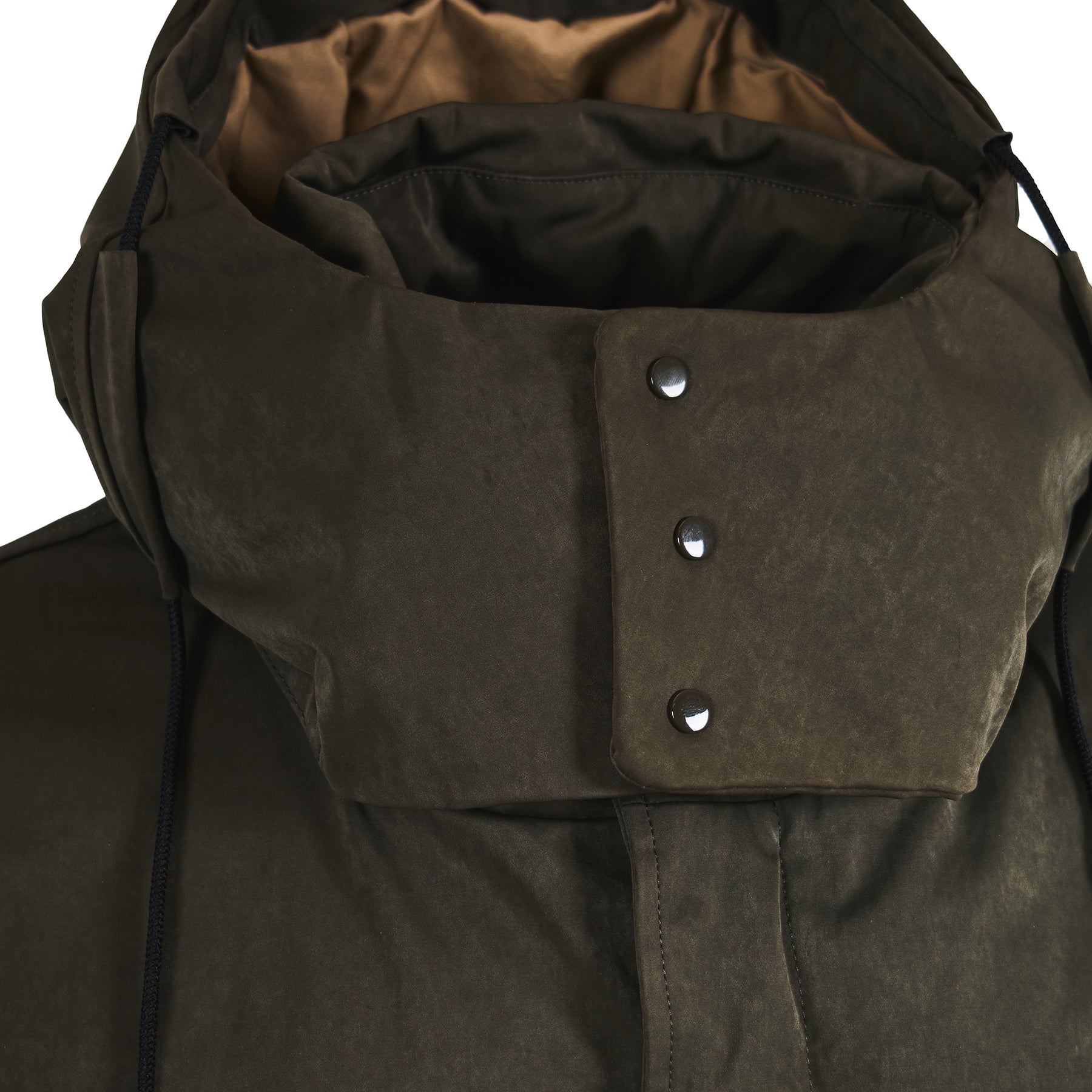 The Ten C Hub Jacket in Green Lizard is a down filled, dyed OJJ jacket crafted by the experts at Ten C. The jacket features a heavy duty zip which is covered by a button down placket, with a special Teflon coating used to create a water resistant coating. These features make this jacket feel as hardwearing as it is luxurious, and is certainly a piece that is designed to last the test of time, wearing to the individual owner, and developing more character with each use. The outer shell is made with dyed OJJ fabric, and the jacket contains a nylon liner which is filled with hypoallergenic goose down. There is a Ten C label on the inside, featuring their signature red stamp and handwritten size.
