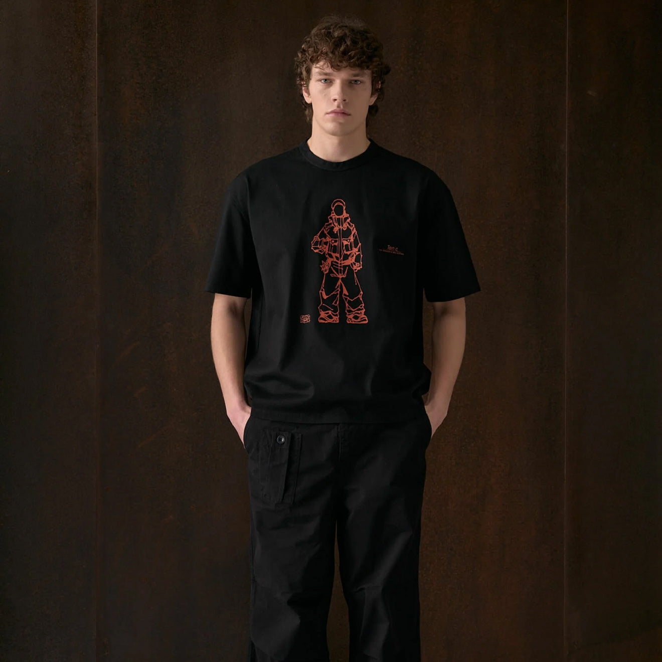Featuring a sketch print on the chest of the Scotch character wearing the Tempest jacket, this black tee brings together illustration and design in a subtle, expressive piece.