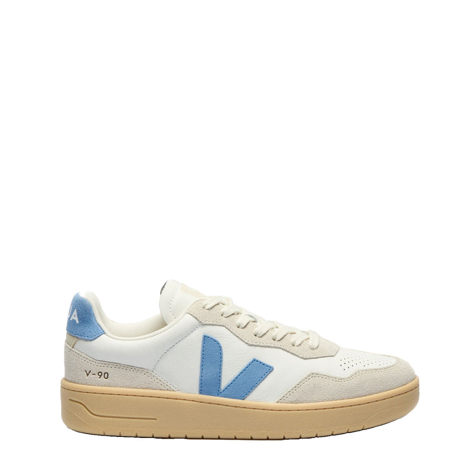Crafted with a blend of retro and contemporary design, the Veja Womens V-90 Extra-White / Aqua / Natural is a perfect fusion of 90s athletic fashion and modern elements. This sneaker offers the ideal combination of style and comfort. It is made of the finest leather, sourced from certified organic farms in Uruguay, and undergoes a mechanical beating process to ensure a soft and flexible finish - all part of VEJA's commitment to sustainability.