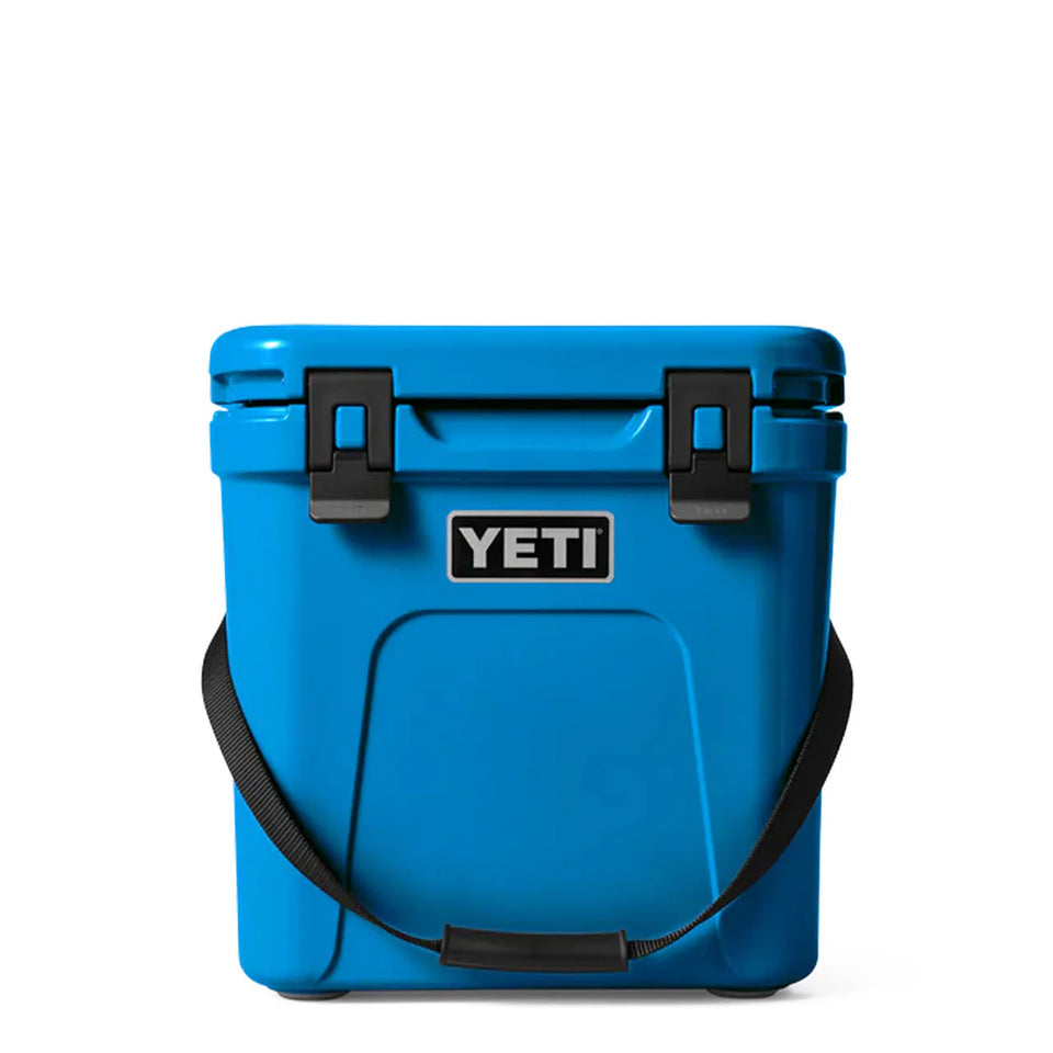 YETI Roadie 24 Cool Box in Big Wave Blue. Made for the road and ready to go – The Roadie® 24 Cool Box packs more while taking up less space. It’s built tall to accommodate critical bottles of wine and slim enough to squeeze behind the driver’s or passenger’s seat of a car.